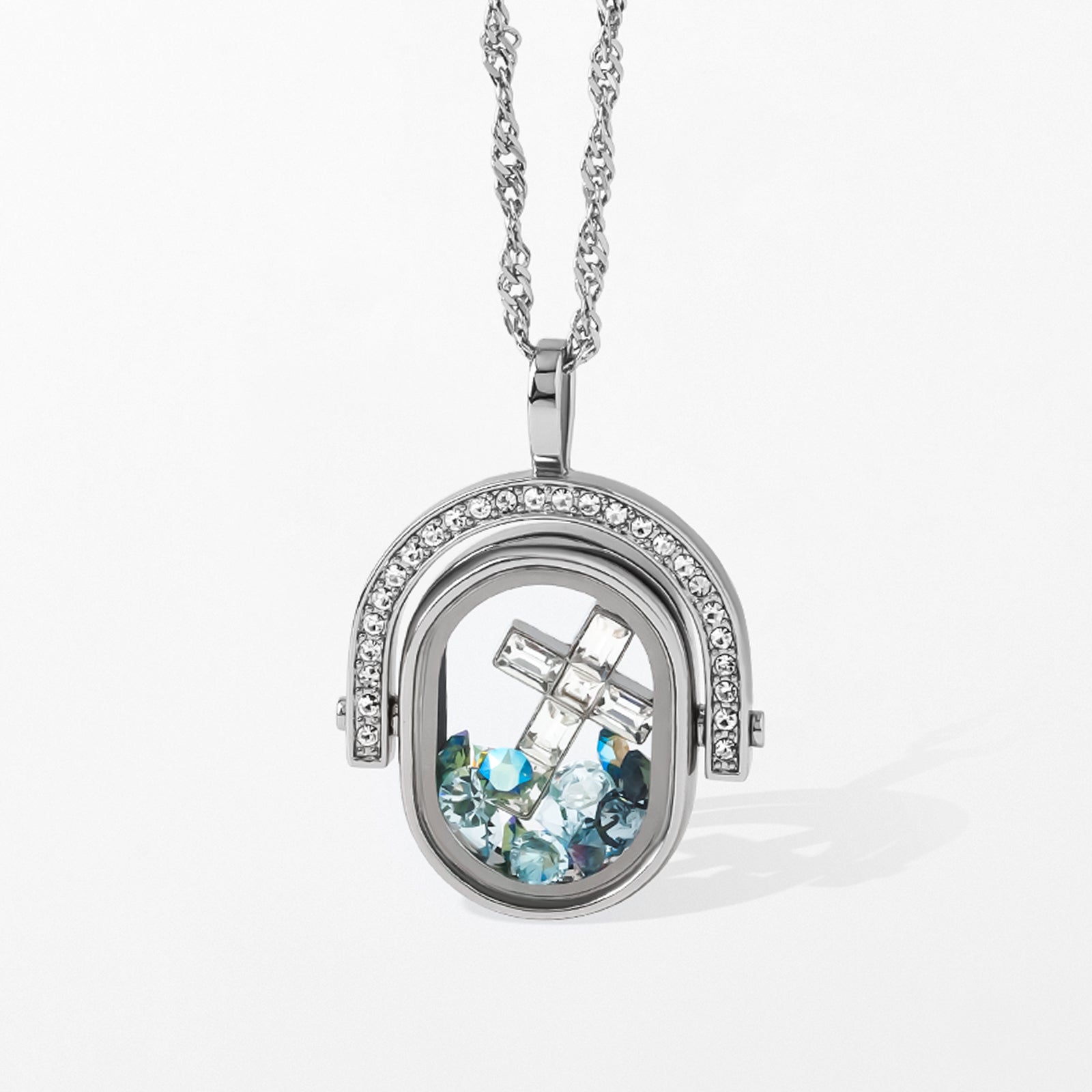 Celebrate your faith with our Faithful Reflections Living Locket Set. This set features a small silver spinning locket adorned with shimmering crystals, a Neutral Sage Crystal Stardust Pack for a soft, earthy glow, and a Luxe Crystal Cross Charm. Let this locket be a reminder of your spiritual journey. This locket is an elegant keepsake and perfect for daily wear or as a gift to someone special this holiday season.
