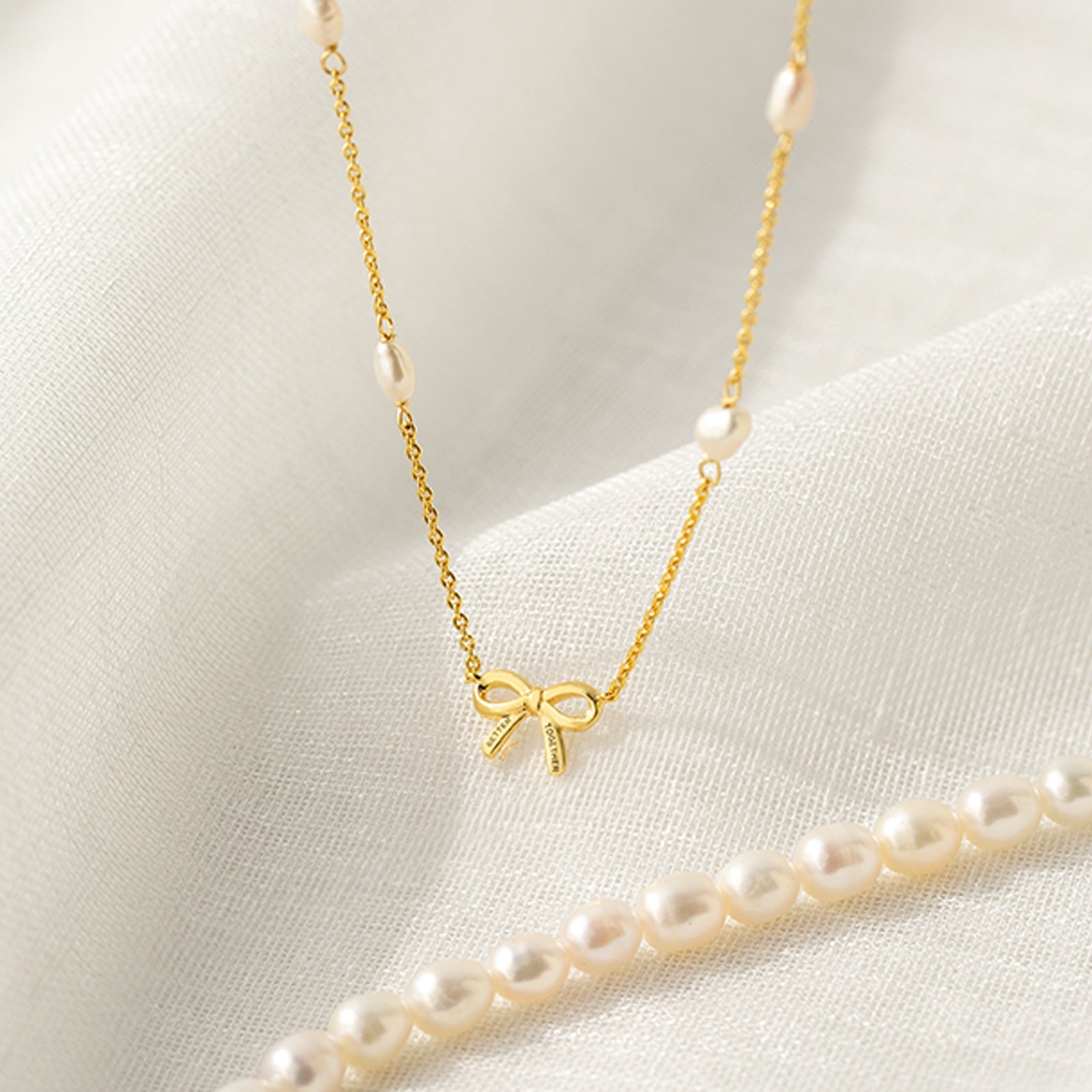 A keepsake for all ages! Celebrate the special bond with our Mama and Me Pearl + Bow Necklace. Featuring freshwater pearls and the phrase "Better Together" on the bow, this 16-19" pearl necklace is a perfect way to share style and sentiment between mom and child. Perfect for the holiday season, this piece adds a touch of grace and unity to every mother-daughter duo.