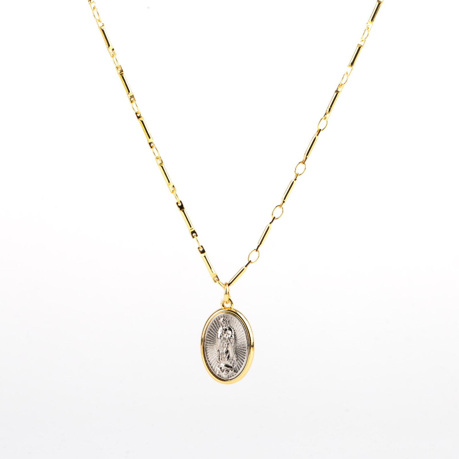 The Our Lady of Guadalupe Necklace is a tribute to faith, devotion, and tradition. Featuring a gold pendant with the iconic image of Our Lady of Guadalupe, this 18–20" necklace is designed to be worn close to the heart. Its classic styling makes it a thoughtful gift or personal keepsake. This gold Virgin Mary necklace is a timeless symbol of love and protection.