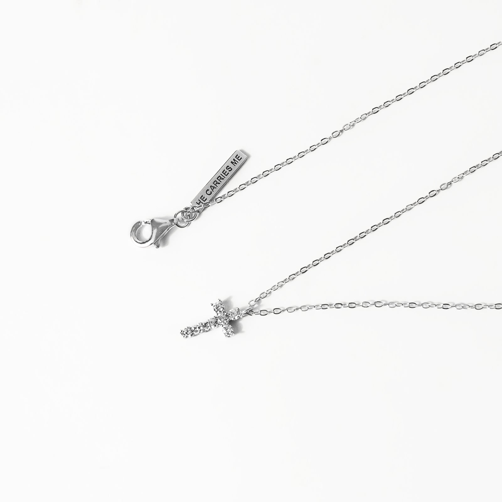 Welcome in divine simplicity with our .925 Sterling Silver Demi Fine Silver Dainty Cross Necklace! This 16-19" dainty demi-fine necklace exudes grace and features a tag with the phrase "He Carries Me", providing a subtle yet powerful statement of faith. Perfect for every day wear or special occasions, our dainty cross necklace is a must-have addition to your jewelry collection.