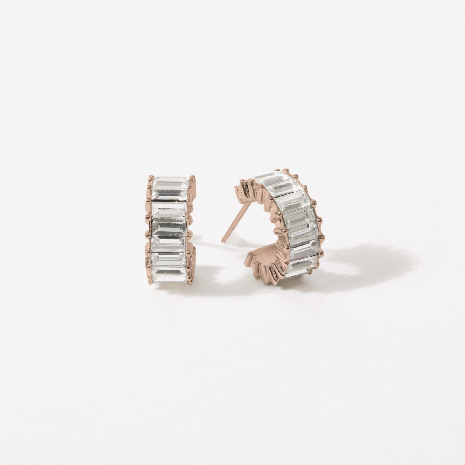 The Rosette Mini Hoops will be your new everyday favorites! Designed with sleek rose gold and subtle baguette-cut crystals, these mini hoop earrings bring just enough sparkle to elevate your look without overpowering it. Wear them solo for effortless shine or stack them with other stud and huggie earrings for an on-trend layered ear moment.