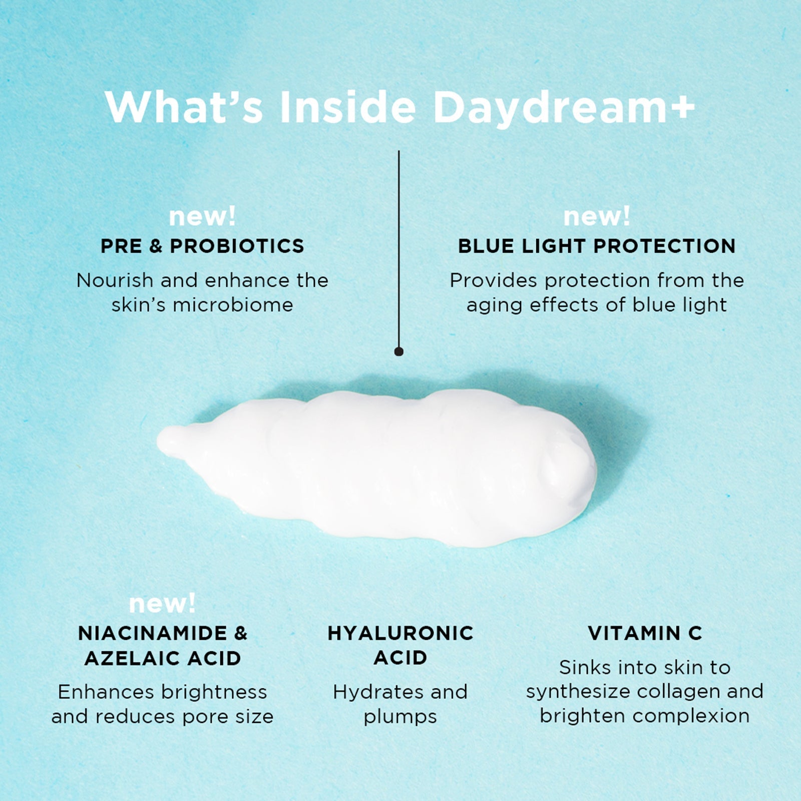 Daydream+ delivers the latest in skin technology, providing all-day hydration and nourishment without any harmful ingredients. Infused with hyaluronic acid, Daydream+ hydrates various layers of your skin, while Niacinamide and a blend of Azelaic acid and Vitamin C brighten your skin's complexion.