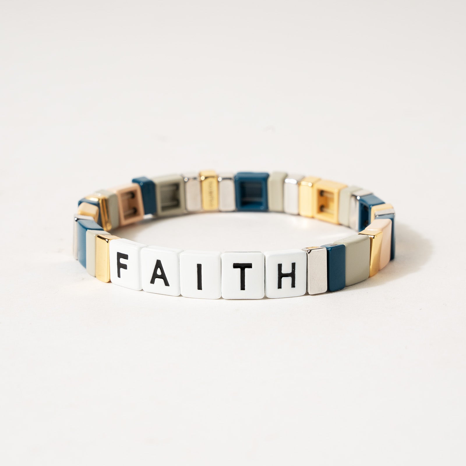 Wear your faith on your sleeve with our stylish and meaningful "Faith" Tile Bracelet. Featuring the word "FAITH" and adorned with multi-colorful tiles, this bracelet is the perfect way to express your faith and inspire others.