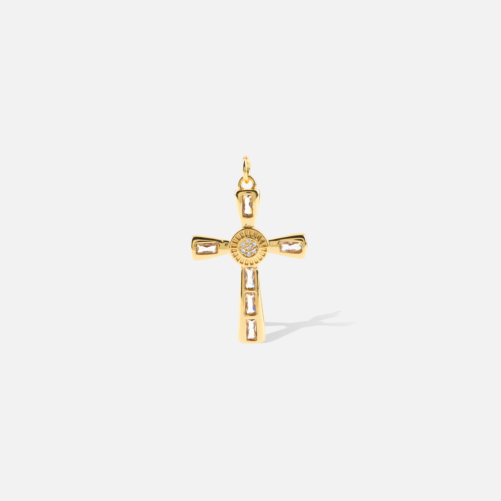 Radiating elegance and strength, the Grace Cross Charm Pendant features a center crystal stone surrounded by baguette-cut brilliance. Let this charm pendant shine on a charm bracelet or charm necklace as a symbol of faith and clarity.