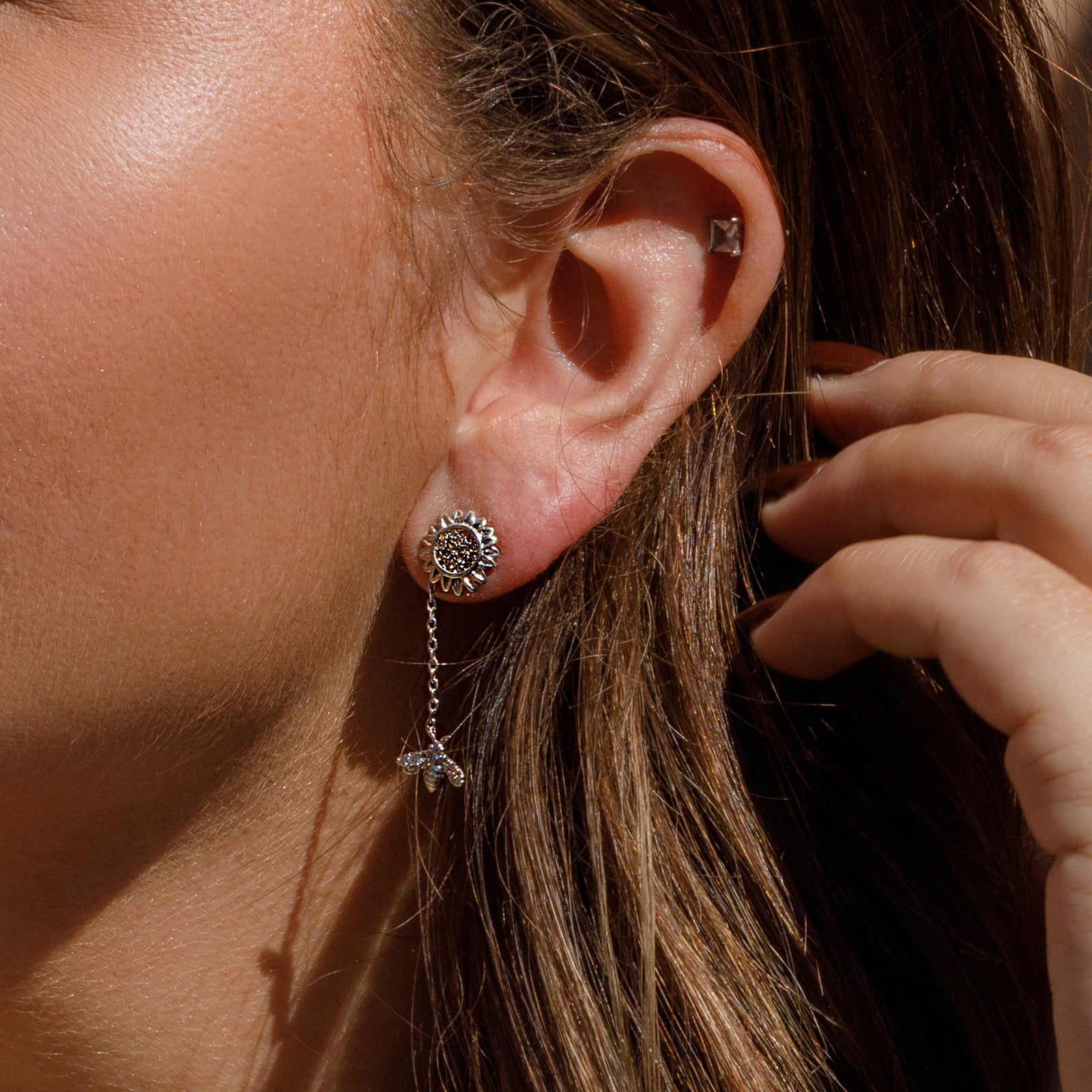 The Honey Bloom Earrings bring the charm of sunflower fields and buzzing bees to your everyday look. These drop earrings feature delicate florals and a sweet bee accent and captures the spirit of fall.