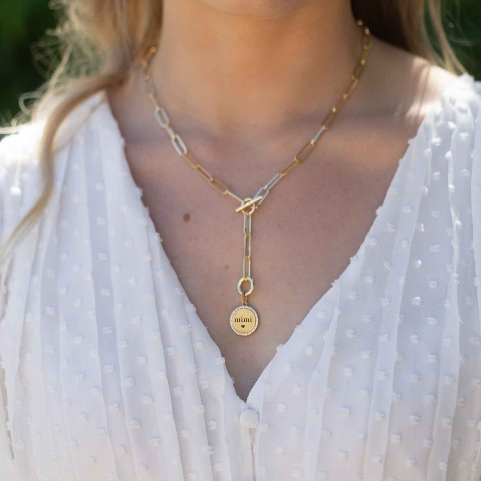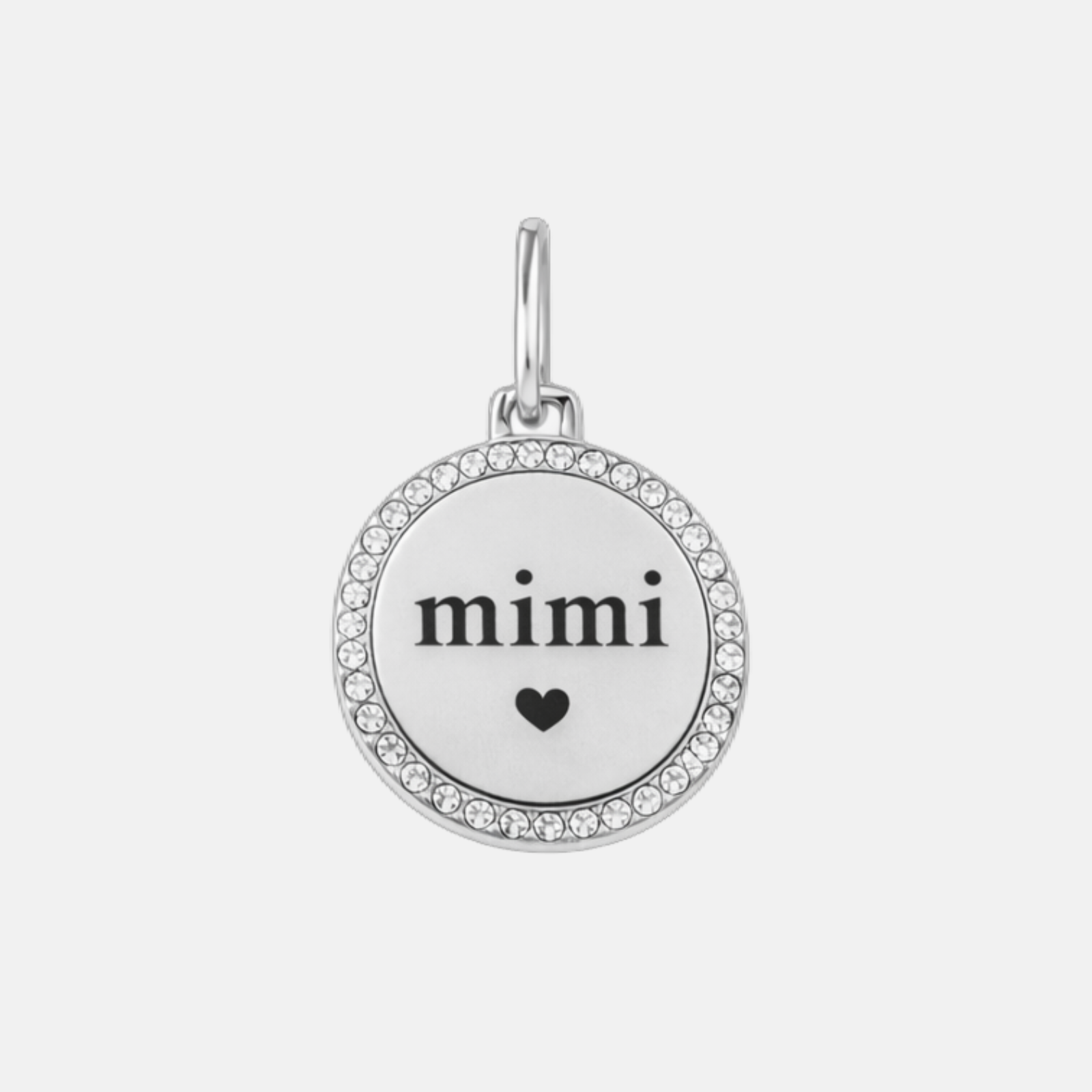 A name that means everything. The Mimi Crystal Inscription Plate features a circular engraved plate with “mimi” at the center, framed by a delicate halo of crystals for a soft, radiant sparkle. Designed to add to a chain or clip onto a carabiner, it’s a meaningful, gift-ready piece she’ll wear close every day.